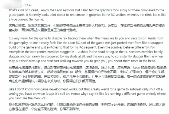 在数毛社的独家播客中,其成员约翰·林内曼进一步解释了卡普空的调整逻辑:光线追踪产生的颗粒感在里昂篇浣熊市关卡中尤为明显,而现有降噪工具无法适配该场景的高要求开放世界环境,这促使卡普空采取了禁用光追的快速修复方案。但林内曼同时表示,这一解决方案并不理想,卡普空本应提供光线追踪的开关选项,而非直接禁用。