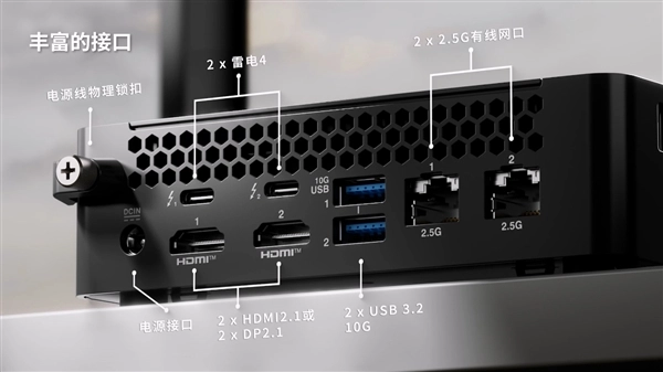 散热与连接性更是诚意拉满:机身内部配备双风扇+多热管散热模组,优化风道设计,即便长时间高负载运行(如视频渲染、AI计算),也能保持稳定性能,同时将噪音压至极低水平;接口配置全面,双2.5G网口满足高速数据传输与企业组网需求,支持Wi-Fi 7与蓝牙6.0,无线传输速率拉满,搭配双雷电4、双HDMI 2.1接口,可支持四屏4K同时输出,轻松适配多屏办公、专业设计等场景。