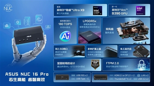 值得重点关注的是,华硕NUC 16 Pro还通过了严苛的军规耐用性认证,经过高温、低温、湿度等九项专业测试,平均无故障运行时间超50000小时,可适应极端使用环境,支持7×24小时不间断稳定运行,是世面少有的硬核Core Ultra X7机型;高强度合金机身搭配优化双风扇+多热管散热,既能保障长效运行的稳定性,又能将噪音控制在极低水平。硬件安全上,内置固件TPM 2.0安全模块,支持零信任安全架构,搭配华硕AI Superbuild技术实现本地AI部署,双重防护防范数据泄露,兼顾长效运行与数据安全,完美适配企业监控、边缘AI推理等需全天候运行的场景。