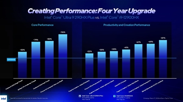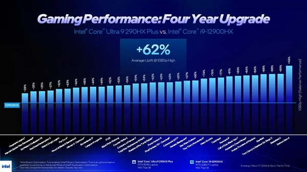 Intel还瞄准第12代酷睿及以前的用户升级需求,相比i9-12900HX,新处理器的游戏性能提升高达62%,单线程性能提升约30%至32%。