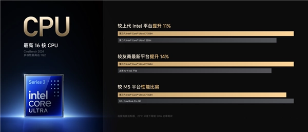 小米笔记本Pro 14至高搭载第三代英特尔酷睿Ultra X7处理器,基于英特尔最新18A工艺打造,CPU晶体管密度提升30%。