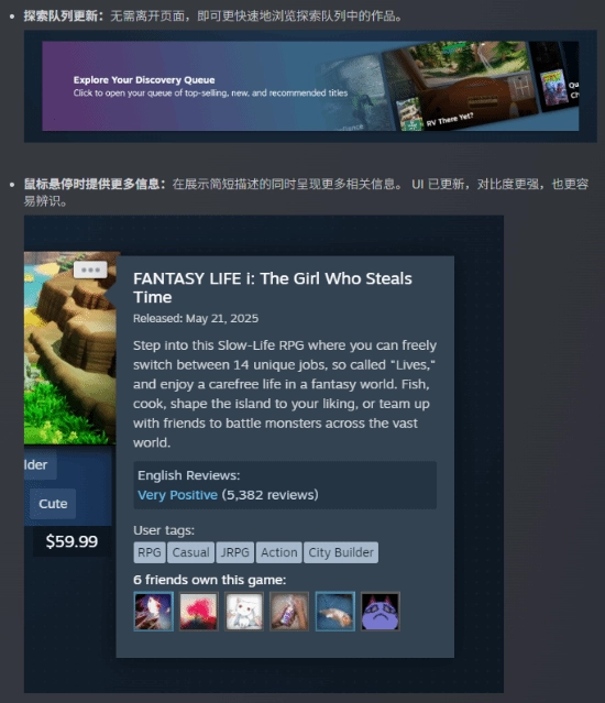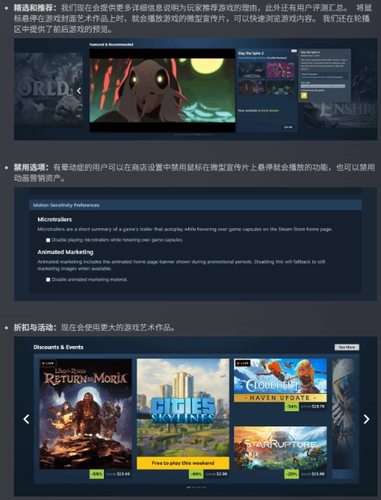 根据官方介绍,全新的布局设计是为了通过呈现更多内容与信息,帮助玩家更轻松地发现新游戏。我们还将展示分辨率更高的游戏艺术作品,提升视觉清晰度。当玩家使用高分辨率显示器时,能看到商店新主页更宽,响应速度也更快。即便在Steam Deck或大屏幕模式下浏览商店主页,这些更新内容同样可见。