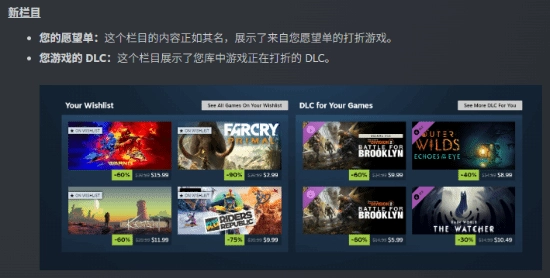 值得注意的是,除了上述优化和改动外,Steam在此次Beta测试更新中还加入了两个新的商店栏目:折扣愿望单&折扣DLC: