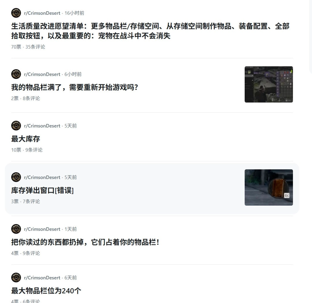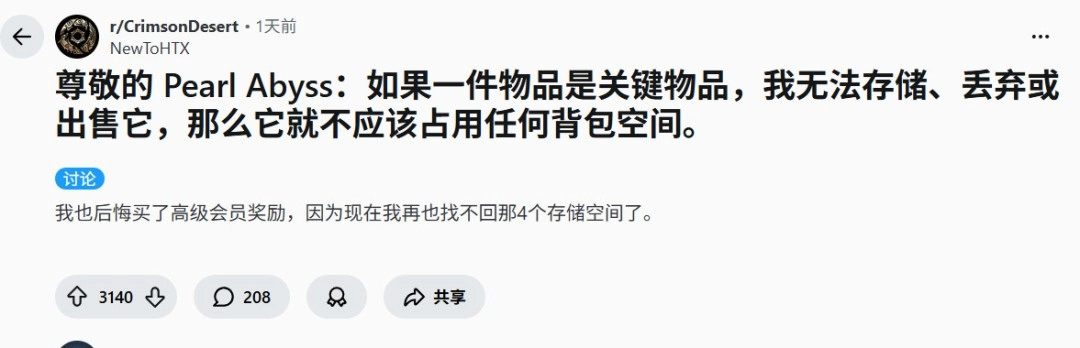 玩家们纷纷涌向《红色沙漠》子版块,继续吐槽这套背包管理系统。目前最热门的一条帖子发布于3月30日,讨论“关键物品”(通常是背包中紫色品质的物品,例如豪华版奖励)不应该占用背包空间。这类物品不会增加主角Kliff的负重,也不会真正占据当前已扩展到240格的背包容量。但问题在于,它们依然会出现在背包中,无法丢弃,还会随着你在Pywell世界探索的深入不断堆积——比如通缉令、任务道具、藏宝图等等,严重增加了杂乱感。