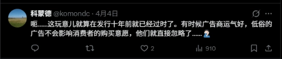 时隔多年,该广告再次被玩家讨论。一部分玩家认为其“大胆甚至带点怪诞”,在当年的游戏行业中颇具话题性;但也有人直言,这样的设计即便放在当时也显得过时且不适。