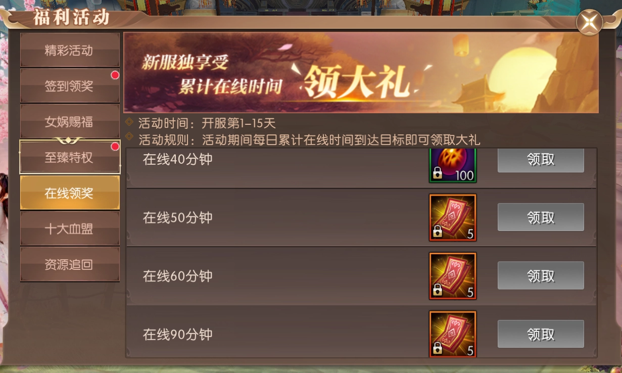 开服的第1-15天,专属于新服的在线领奖活动开启。活动期间,每日累计在线时间到达目标,即可领取在线好礼。请天命者们来到新服并在此驻足停留,享受新服体验的同时,也取尽在线奖励!