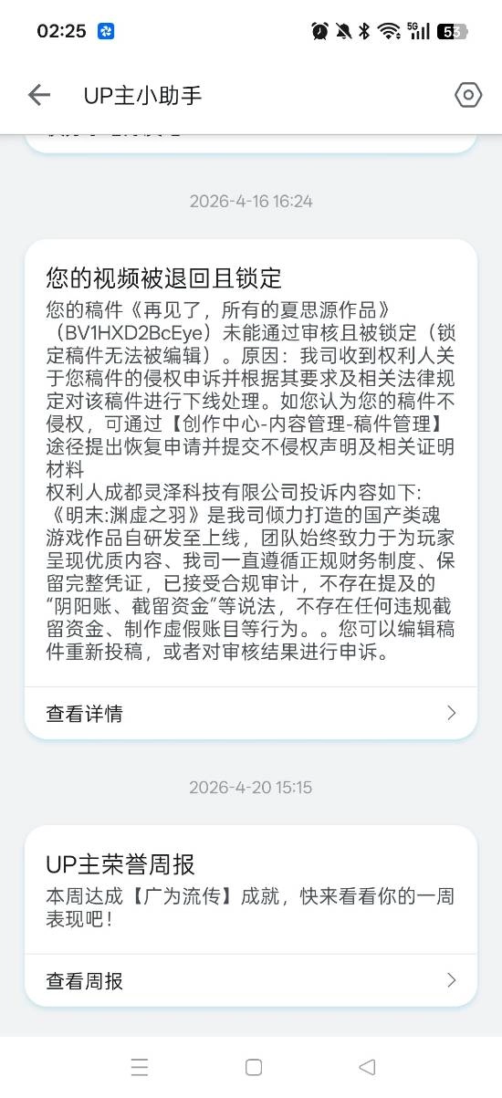 根据B站发布的通知,九保杏树的稿件《再见了,所有的夏思源作品》未能通过审核。灵泽科技在投诉内容中明确表示: