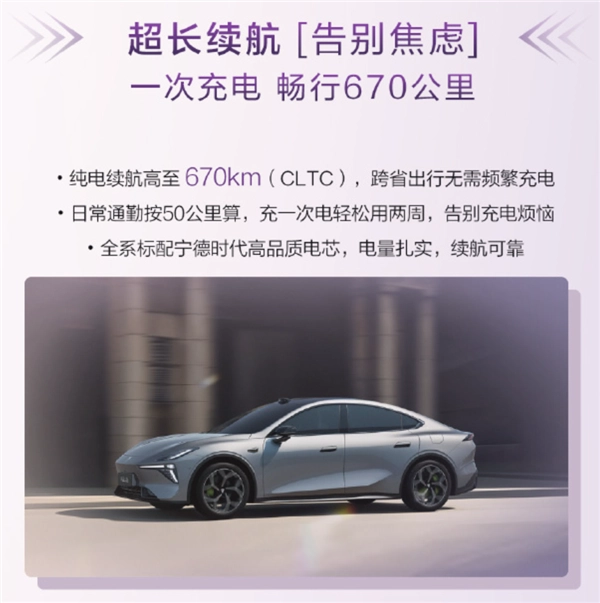 续航方面同样同级领跑,纯电版CLTC续航最高可达670公里,日常通勤按50公里计算,充一次电可轻松使用两周,彻底告别充电焦虑;跨省远途出行也无需频繁补能,配合同级最快快充能力,极速回血满足长途需求。