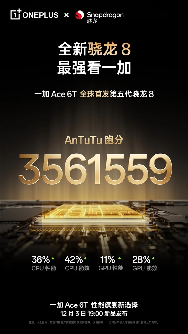 11月27日讯,一加中国区总裁李杰对一加Ace 6T进行预热,该机型将在全球范围内率先搭载骁龙8 Gen5平台(第五代骁龙8),此芯片是由一加与高通携手联合定义的。