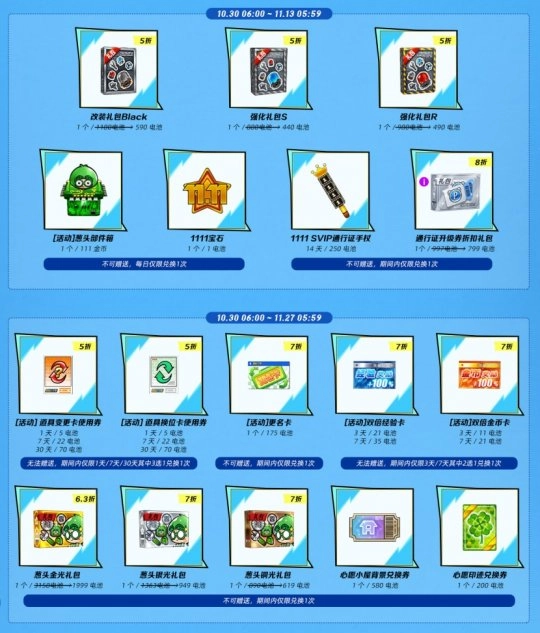 本次更新后,[双11商店]限时开启,详细优惠折扣可见下图~