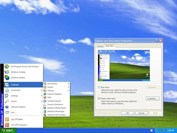 Windows XP于2001年发布,它采用了重新设计的双栏布局的“开始”菜单。左侧栏显示已固定和最近使用的应用,而右侧栏则提供对用户特定的文件夹(“我的文档”、“我的图片”、“我的电脑”和“控制面板”)和系统功能的访问。