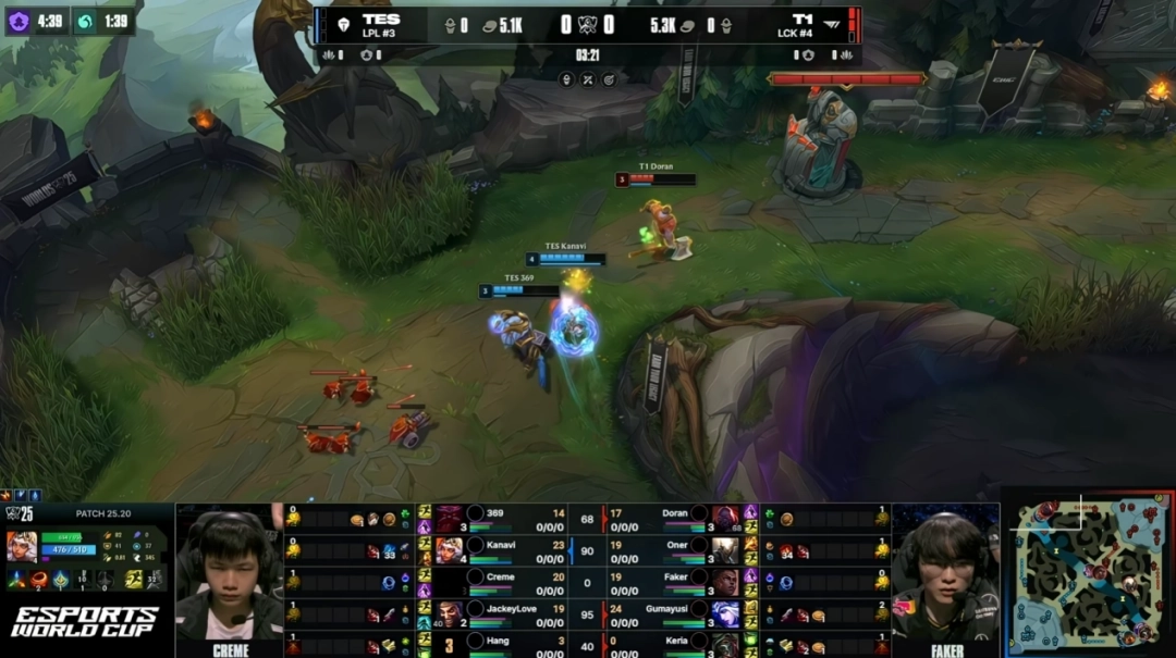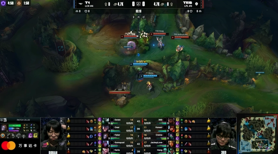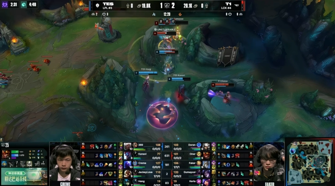 5分43秒,双方中野辅在上半区F6草丛发生缠斗,Faker发条先手拉大被TES中辅闪现躲过,同一时间猴子开启大招留下T1野辅,最终在付出三人闪现并逼出对方野辅闪现后,T1打野赵信被击杀,Kanavi猴子拿下一血。