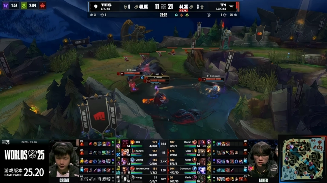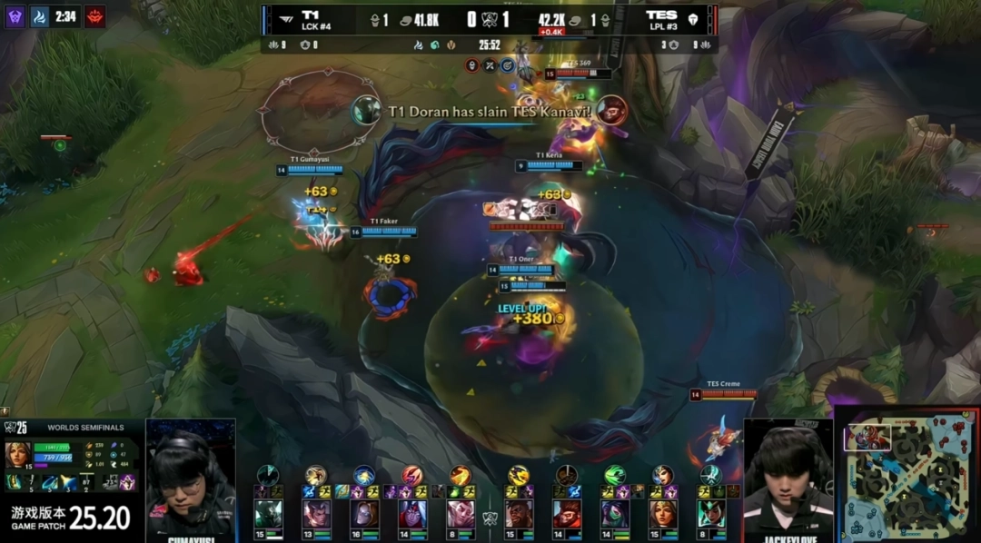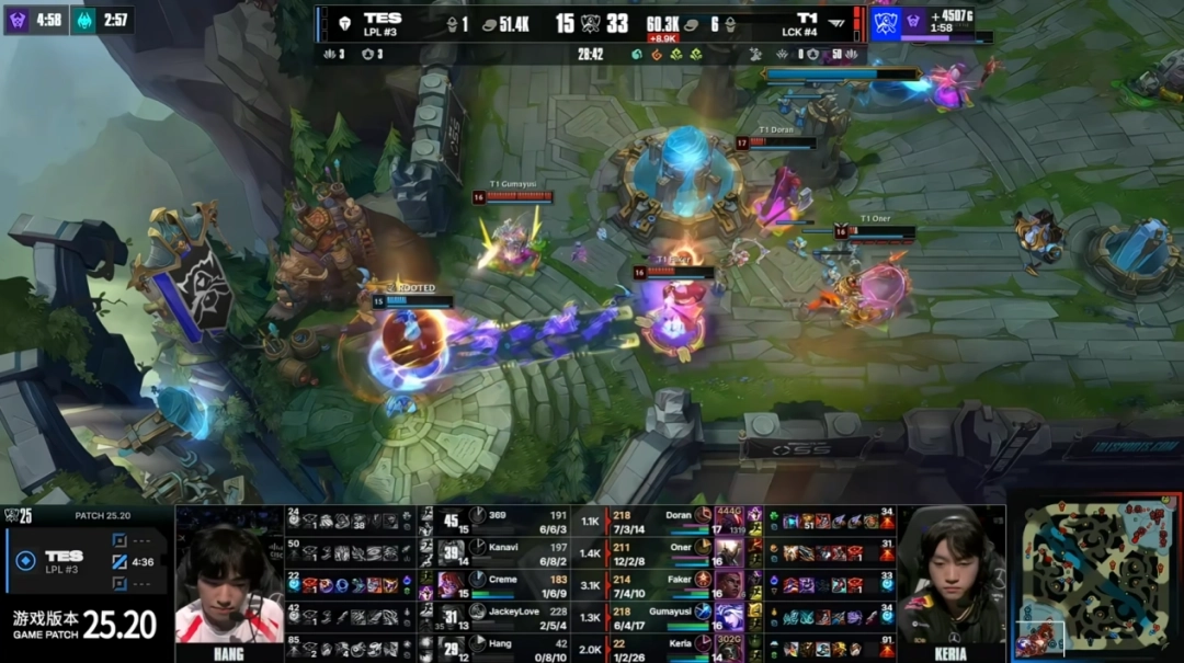 然而,T1稍后的尝试却起到良好效果。14分53秒,Gumayusi的韦鲁斯一发WQ打掉TES辅助Hang卡尔玛的半条血量,并用大招逼出其治疗闪现,先锋紧随其后刷新,TES在本次地图资源争夺中再无战力,只能被迫放弃。