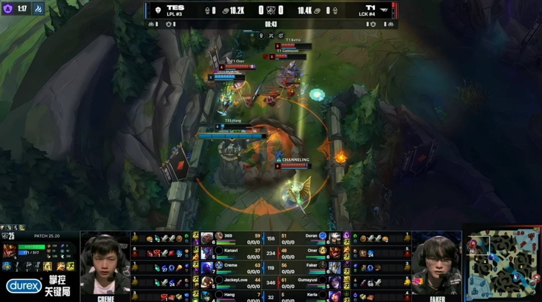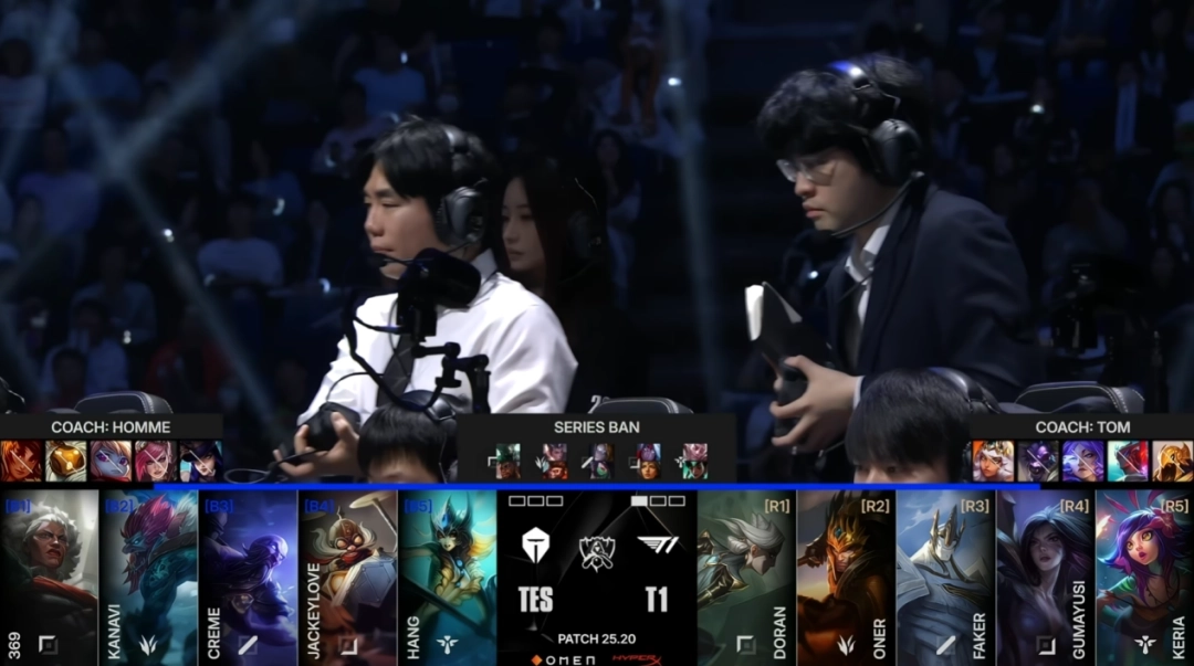 双方最终阵容敲定,TES选出奥恩、琪亚娜、兔子、德莱文、泰坦的强势节奏组合,T1则选出寒冰搭配烈娜塔的强势下路进行压制,中路选到对AL战中起到至关重要作用的梅尔,上野则选出了全图支援能力强大的塞恩与潘森配合艾希射箭,形成“全球流”。