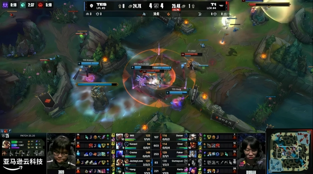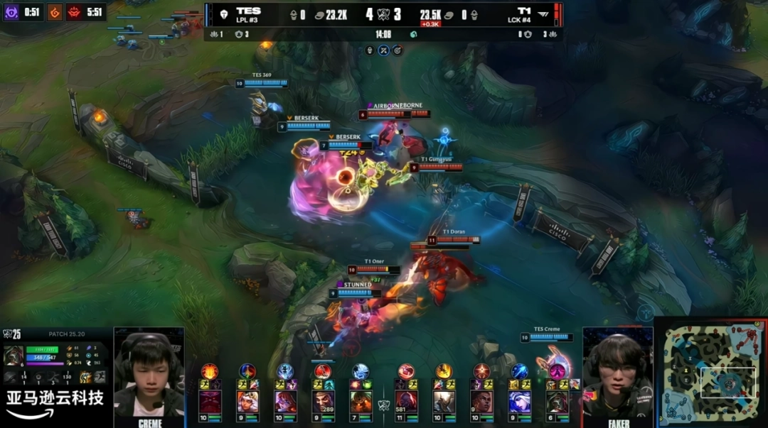 随后,便是资源全掉,团战几乎全输--在23分04秒,T1击杀厄塔汗之时,双方人头比已然来到11分21秒,除上单位369有微小领先外,其余四人的经济全面落后,中单对位经济差更是来到了2400。
