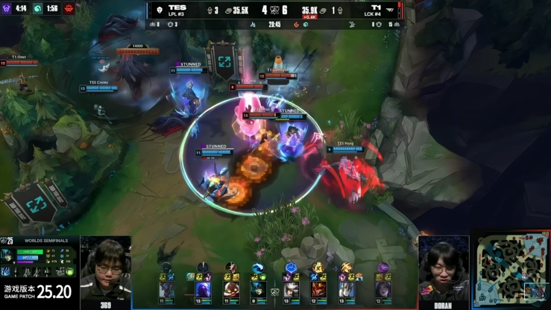 至此,TES再一次陷入了类似第一局的尴尬处境,需要节奏与提速的阵营拿不出节奏,往往只能进行一些勉强的尝试--14分07秒的小龙团战,TES泰坦钩中T1烈娜塔,却被对方恶意收购完美反开,Kanavi琪亚娜试图侧翼进场,却被潘森W定在原地当场秒杀,TES战场被分割为三块,上方是被控住的下路组合和距离较远无法第一时间吸收伤害的上单奥恩,侧翼是被控住瞬秒的打野,下方是难以找到进场空间只能干瞪眼的中单。