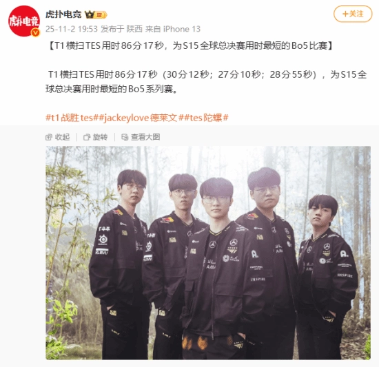 据微博@虎扑电竞消息,本次BO5三局比赛时长依次为30分12秒、27分10秒和28分55秒,累计86分17秒,这是本次全球总决赛用时最短的BO5。另外,TES战队对阵LCK已连续输掉15个小局,战绩相当糟糕。
