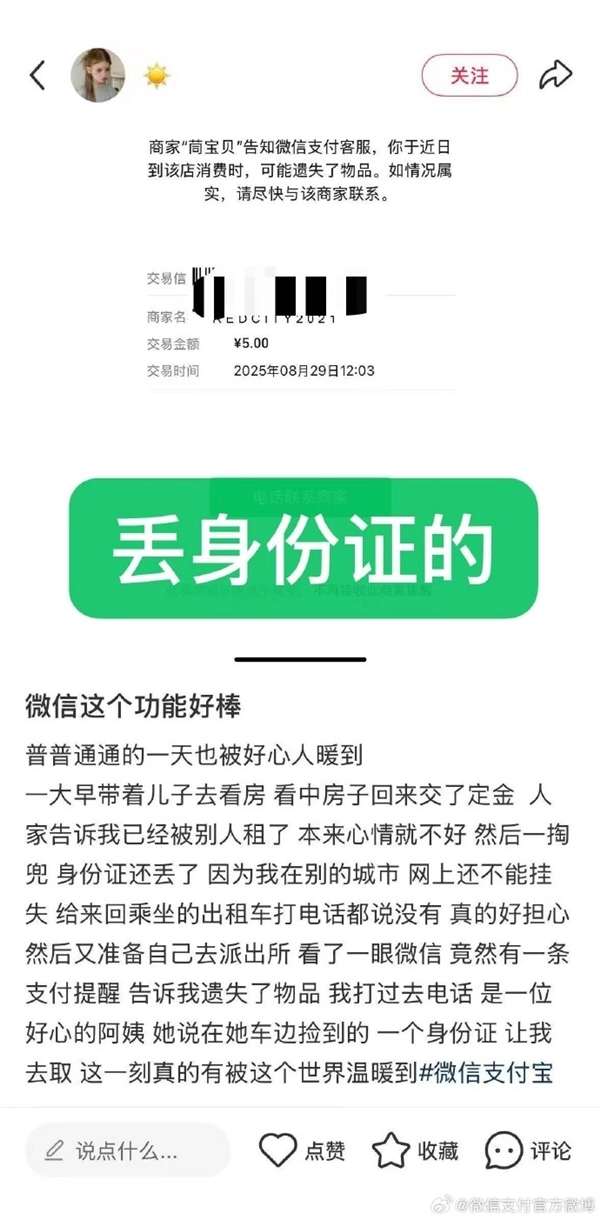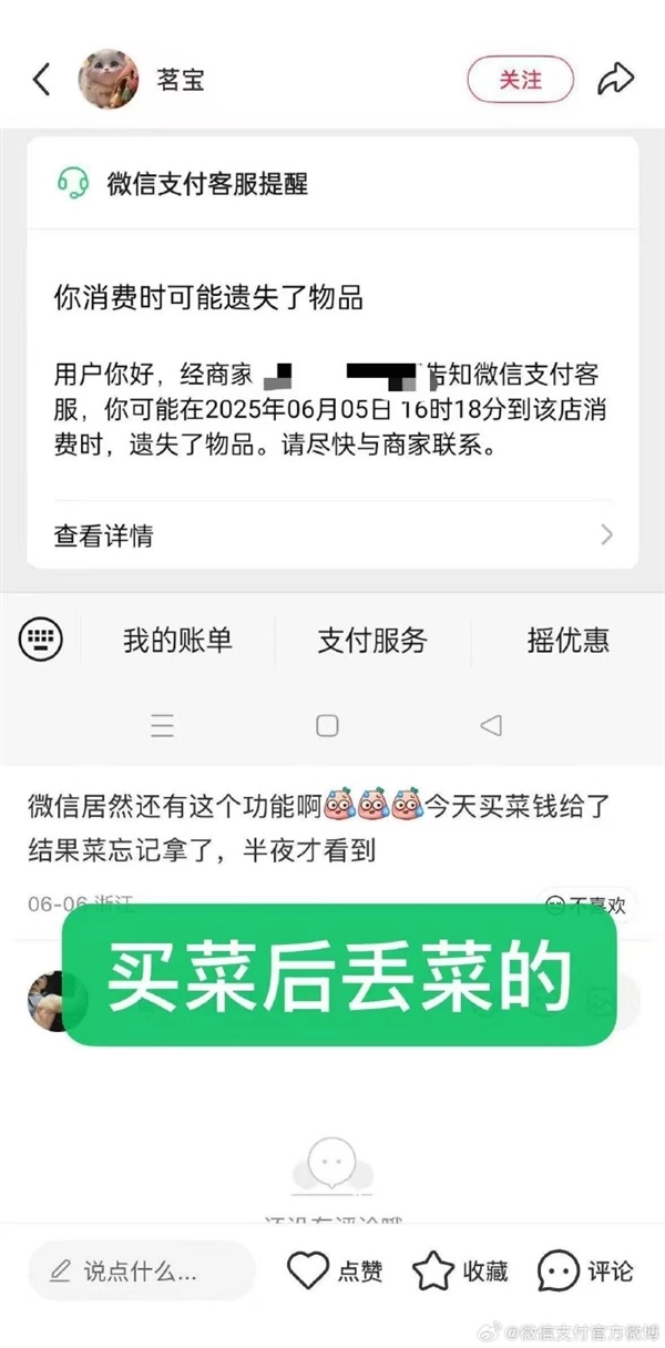 12月18日消息,近日,微博话题#第一次知道微信支付还有这功能#登上了热搜。当你用微信支付完成交易后,要是不慎遗失物品,商家能够借助微信客服联系并提醒你。