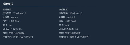 官方标注的系统需求也极为草率,处理器要求为“potato”,显卡也标注为no和yes。