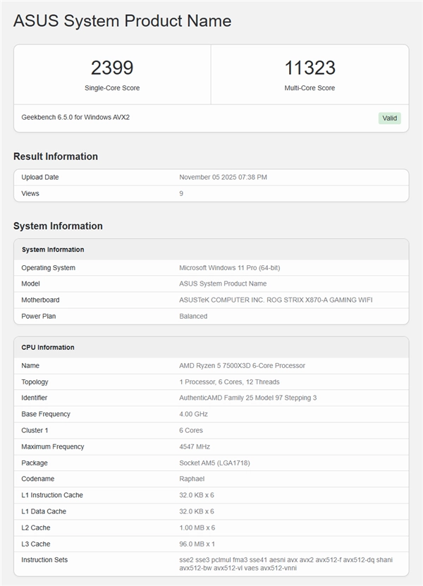 在Windows 11的平衡电源计划下,锐龙5 7500X3D的Geekbench单核得分2399,多核得分为11323分。
