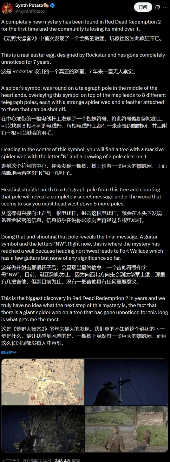 据介绍,他在游戏中心区域的一根电报杆上发现了一个蜘蛛符号。当玩家把这个符号与游戏地图叠加时,会对应到8根不同的电报杆——每根电报杆上都有一张奇特的蜘蛛网,还挂着一根羽毛,这些羽毛都能被射下来。