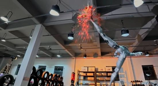 随后,机器人在空中展示了回旋踢,轻松将吊起来的西瓜踢得粉碎。