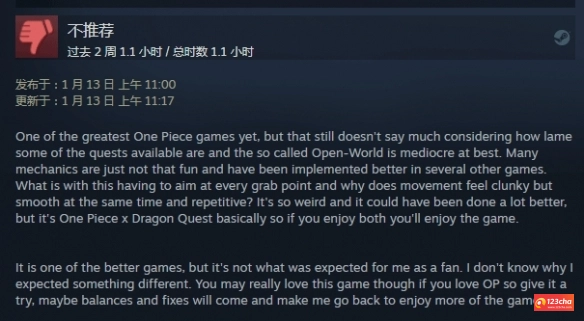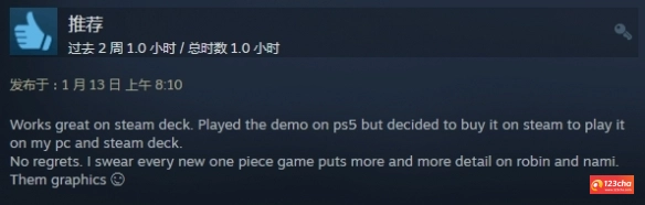 给出好评的玩家认为,这款游戏是海贼王系列中画风最让人感到舒适的作品,甚至可以说是该IP下最出色的RPG游戏。游戏制作精良,对原作的还原度很高,粉丝玩家体验后都十分满意。另外,该游戏在Steam Deck掌机上的运行表现也相当不错。