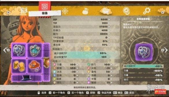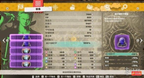路飞和索隆这两个角色是减TP50%的,其他角色则是加攻击的。合成的时候,三个暴击率要达到34%(超成功状态),四个孔位要把三抗属性拉满,剩下的11个孔位全部用来加攻击。