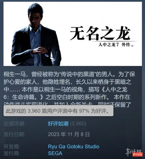 《如龙7外传》围绕桐生一马的视角展开叙事,呈现的是《人中之龙6:生命诗篇》后续的故事内容。截至目前,该作在Steam平台收获的所有评测均为特别好评,在3960条用户评价里,好评率达到了97%的高比例。不少玩家都对游戏中引人入胜的剧情以及流畅的动作战斗系统给予了称赞。