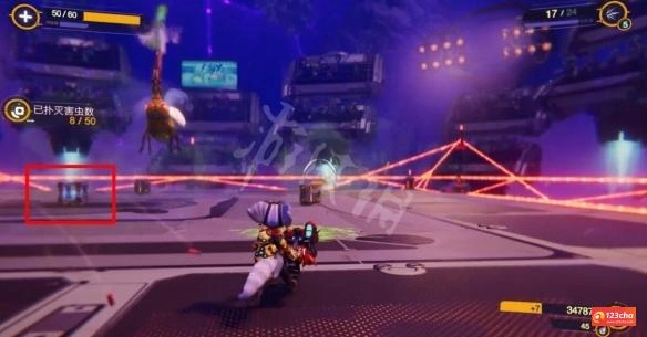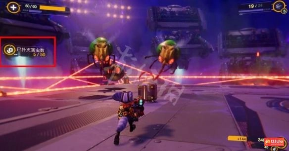 该挑战场地中布满毒气会使我们不断损失生命值,我们需要在生命值降为0之前消灭50只昆虫。